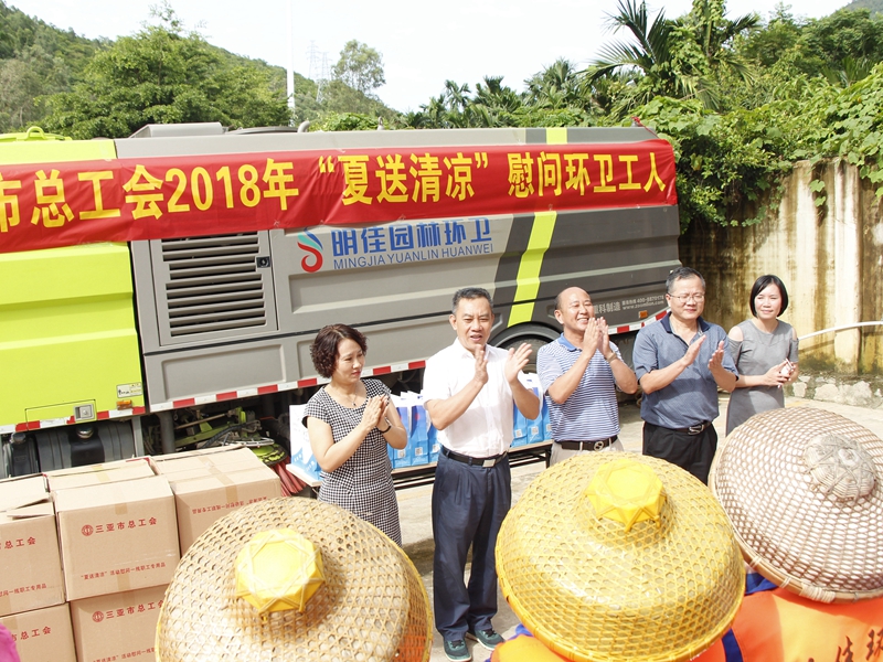 “你們辛苦了!感謝你們?yōu)槿齺喪忻?、游客?chuàng)造了一個(gè)干凈整潔的人居環(huán)境,為三亞市“創(chuàng)文鞏衛(wèi)”工作作出的突出貢獻(xiàn)。”。張羽飛代表三亞市總工會(huì)向集團(tuán)公司全體職工致以親切的慰問。他指出,環(huán)衛(wèi)工人頭頂列日,揮灑汗水,以“寧愿一人臟,換來萬家凈”的精神,為靚扮鹿城、建設(shè)國際化熱帶濱海旅游精品城市提供衛(wèi)生保障。他勉勵(lì)大家繼續(xù)發(fā)揚(yáng)三亞環(huán)衛(wèi)人的精神,勇當(dāng)尖兵的決心,提高環(huán)衛(wèi)作業(yè)質(zhì)量,在三亞市社會(huì)文明大行動(dòng)和新一輪“創(chuàng)文鞏衛(wèi)”工作中作出新的更大貢獻(xiàn)。