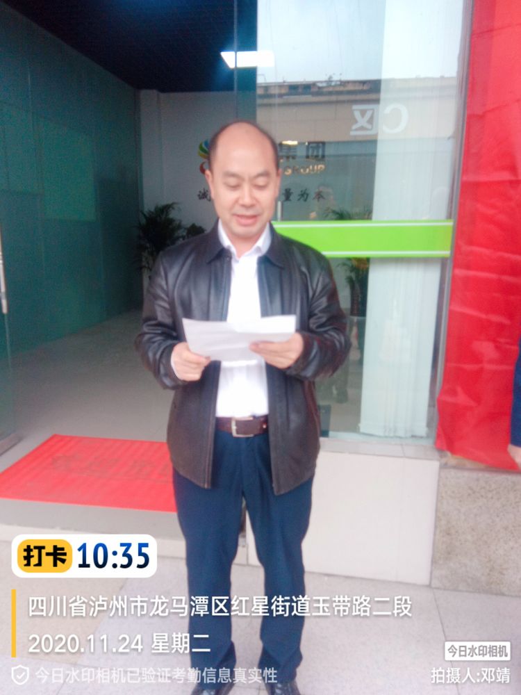 揭牌儀式前,項目經(jīng)理張明強致辭,回顧了從7月份開始接管后的重大事件,感謝所有員工的辛勞付出,他表示在今后的工作中,我們要更加努力,認真工作,服從區(qū)委區(qū)政府、業(yè)主單位各級領(lǐng)導的調(diào)配,熟練掌握操作技巧,提高安全意識,把我們龍馬潭區(qū)的環(huán)衛(wèi)管理工作做得更好,用認真工作的態(tài)度,用我們的實際行動,為營造優(yōu)美、整潔、和諧的龍馬潭區(qū)城區(qū)環(huán)境而努力,提升城市品位。為公司在四川的發(fā)展奠定堅實的基礎(chǔ)。