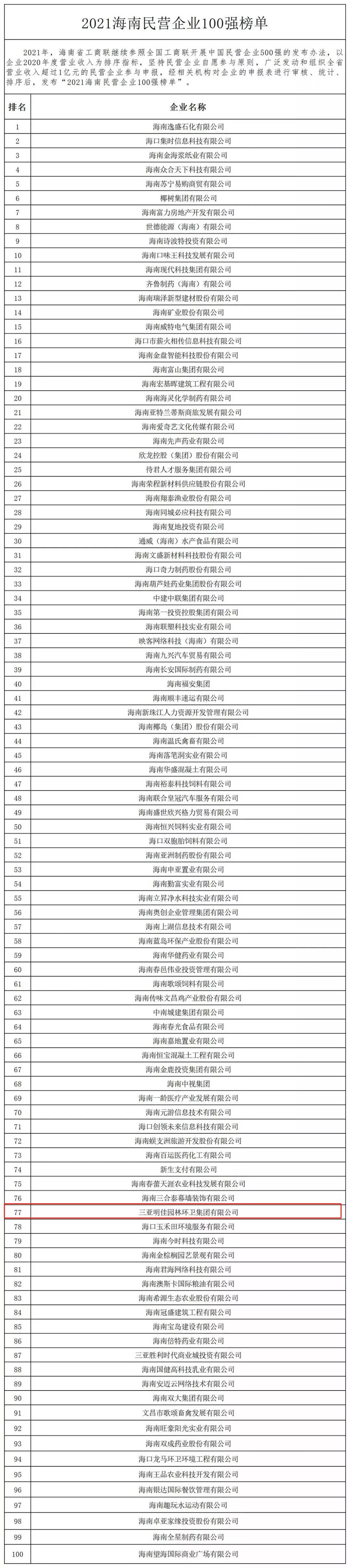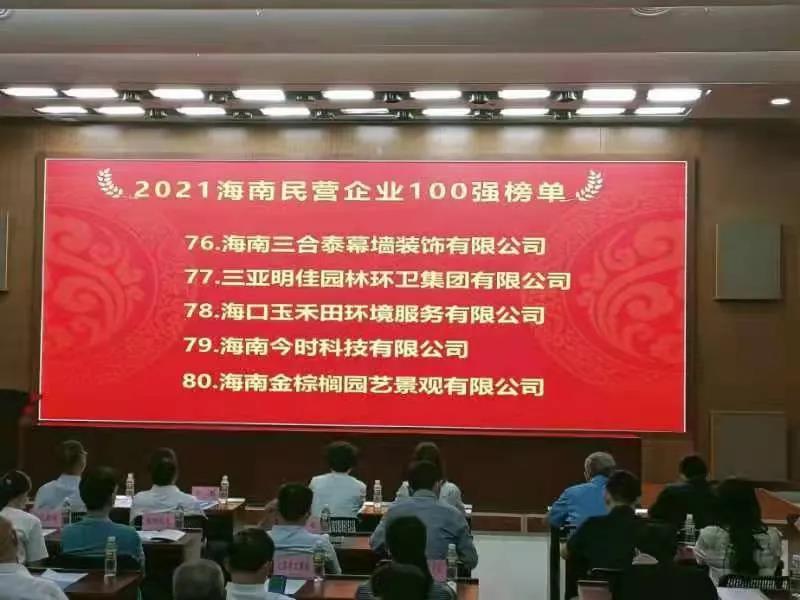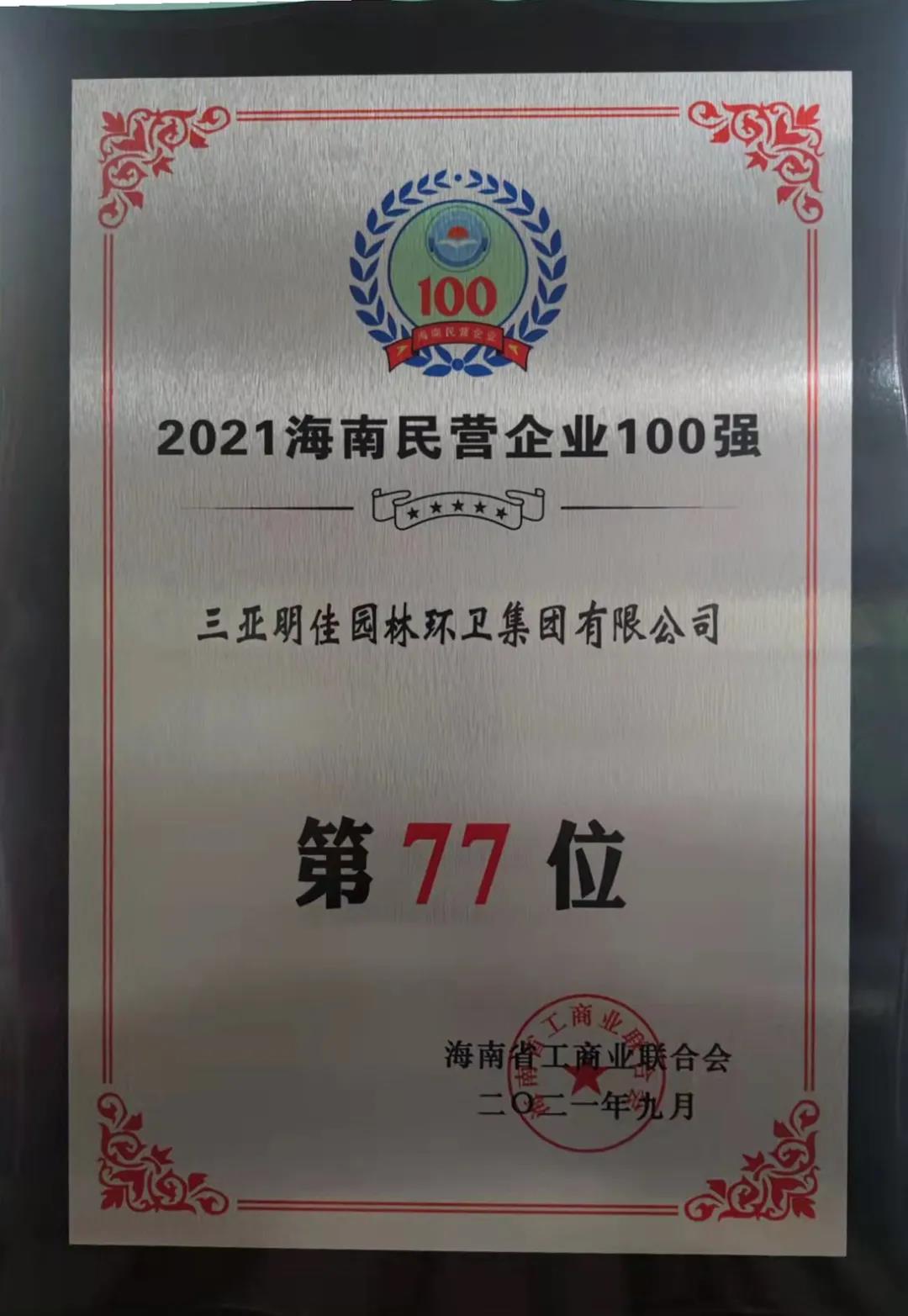 11月4日,海南省工商業(yè)聯(lián)合會在??诎l(fā)布“2021海南民營企業(yè)100強(qiáng)”榜單。三亞明佳園林環(huán)衛(wèi)集團(tuán)有限公司2019至2021年連續(xù)三年入選海南民營企業(yè)100強(qiáng)。